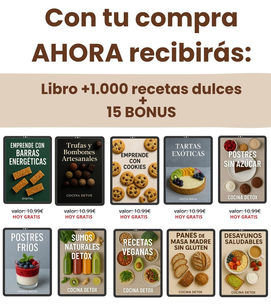 -15 BONUS de regalo que incluyen libros como: postres frios, barras energéticas, trufas y bombones, comida saladas, desayunos completos, batidos, sumos, dieta detox, etc.